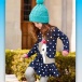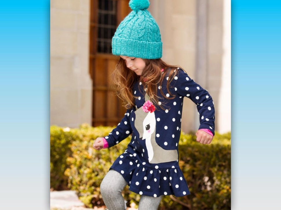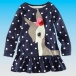 Платье для девочки трикотажное темно-синее в горошек "Олененок"- по низу платья волан, перед декорирован принтом, цветами из атласной ленты и стразами, трикотаж, Cotton, размер 18M, (примерно на 12/18 месяцев, рост 83/88 см).