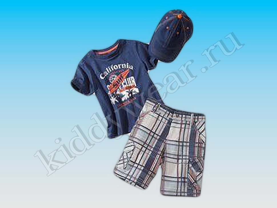Комплект для мальчика 3 в 1 (футболка + шорты + кепка). Футболка - темно-синяя, перед декорирован принтом, трикотаж, 100% Cotton; шорты - бело-синие в клетку, на поясе регулируемая резинка, по 2 кармана спереди, сзади и на бедрах, 100% Cotton; кепка - темно-синяя, с твердым козырьком, объем регулируется липучкой сзади, 100% Cotton; размер 2/4 года, рост 98/104 см.